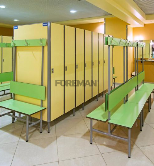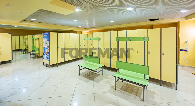 В раздевалках центра установлена мебель FOREMAN® из экологичного слоистого hpl-пластика: односекционные шкафы, двухсекционные шкафы с интегрированной скамьей, односторонние и двухсторонние скамьи, а также полки с отверстиями под фены.