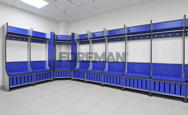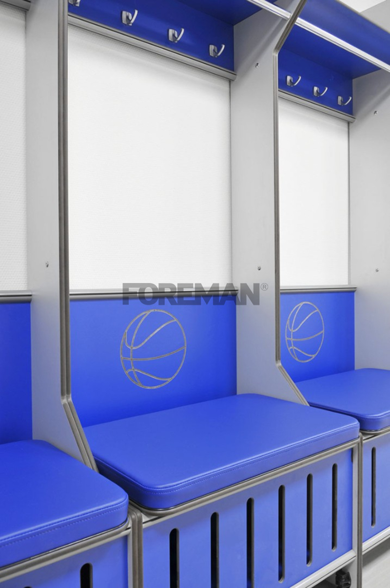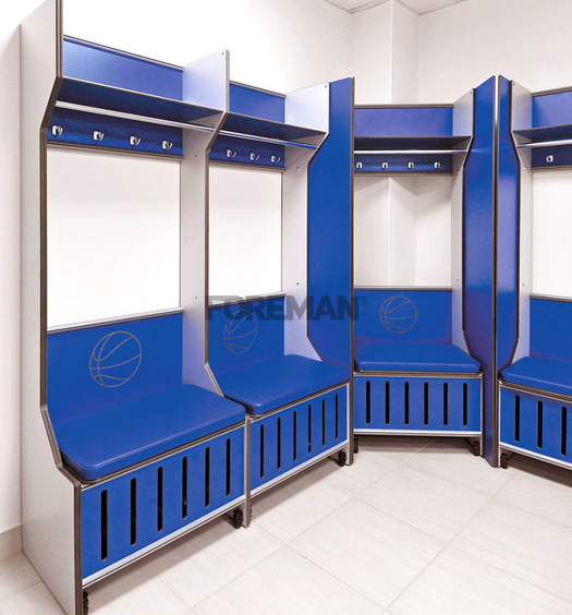 Специализированные секции шкафов для спортсменов, изготовленные для спортивного комплекса, предназначены для раздевалок баскетбольных команд. Внизу каждой секции расположен вместительный отсек для сумок со спортивной экипировкой и обувью. Отсек имеет решетчатую конструкцию для проветривания. Наличие полок и крючков для верхней одежды позволяет рационально размещать личные вещи игроков.