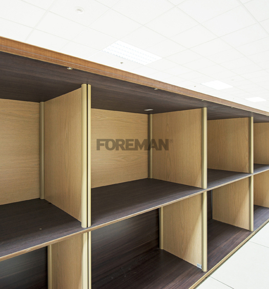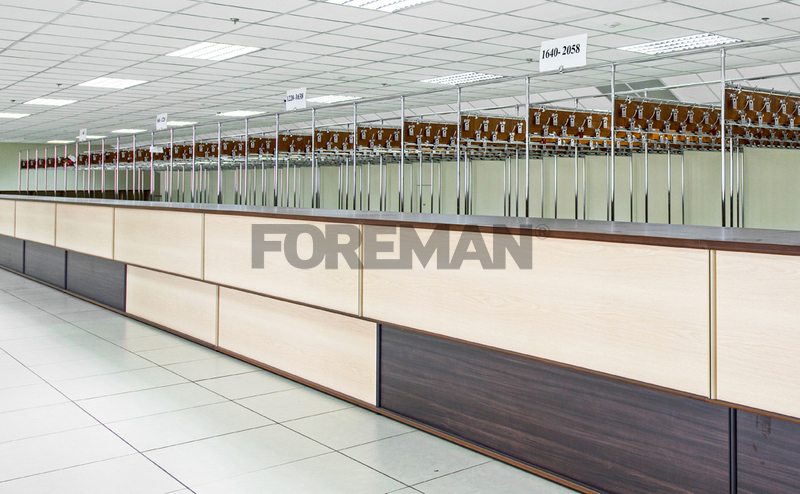 В спортивном комплексе установлена индивидуально разработанная конструкция гардеробной стойки FOREMAN®. При разработке стойки были учтены все пожелания клиента, а также особенности помещения. Технология фигурной резки HPL-пластика позволила воспроизвести сложные контуры для оформления элементов мебели нестандартных форм.